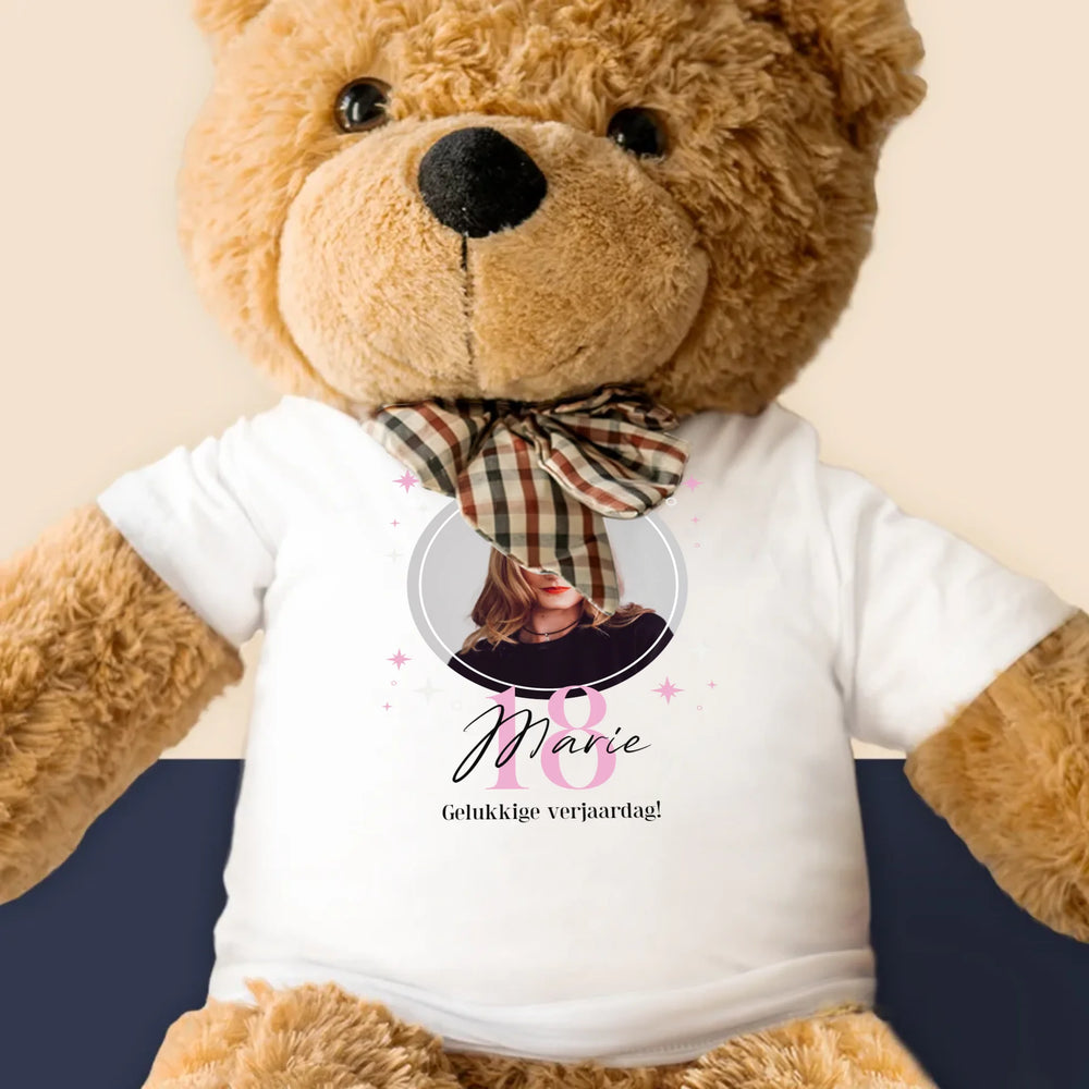 Grote knuffelbeer met jouw gekozen ontwerp.