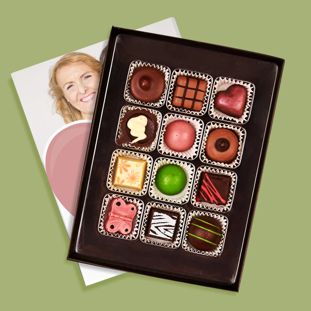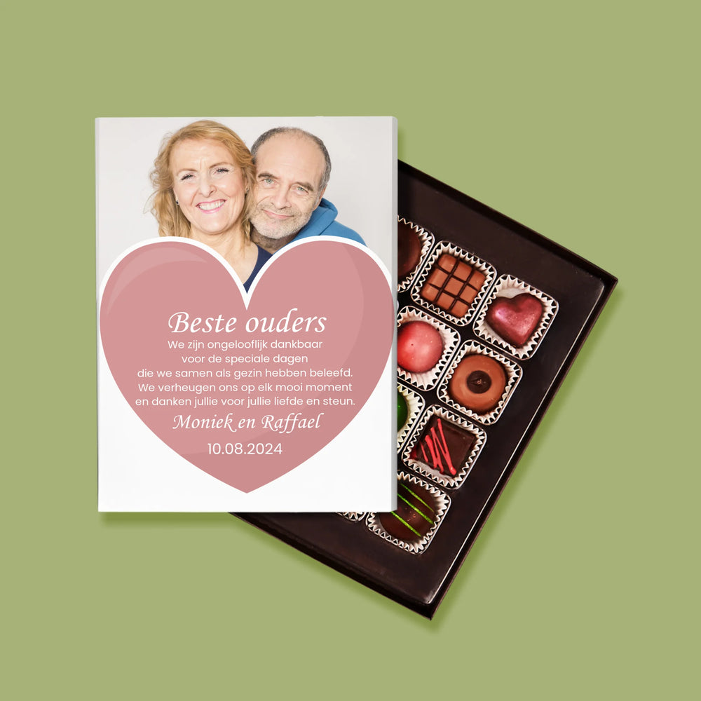 Heerlijke Belgische chocoladepralines in een elegante doos met de personalisatie naar keuze.