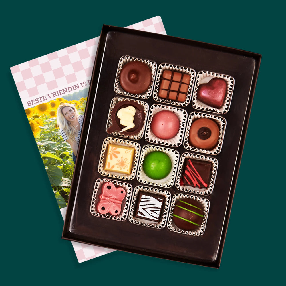 Heerlijke Belgische chocoladepralines in een elegante doos met de personalisatie naar keuze.