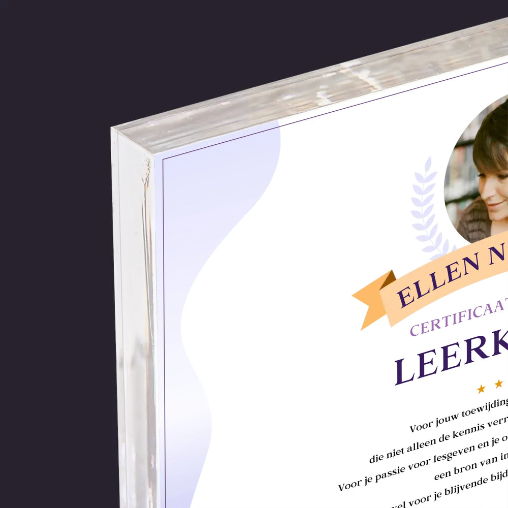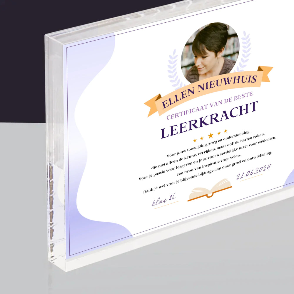 Foto En Handtekening: Certificaat Van De Beste Leerkracht - Acryl blok - Horizontaal