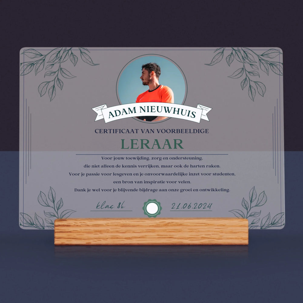 Foto En Handtekening: Certificaat Van Voorbeeldige Leraar - Afdruk op acrylglas