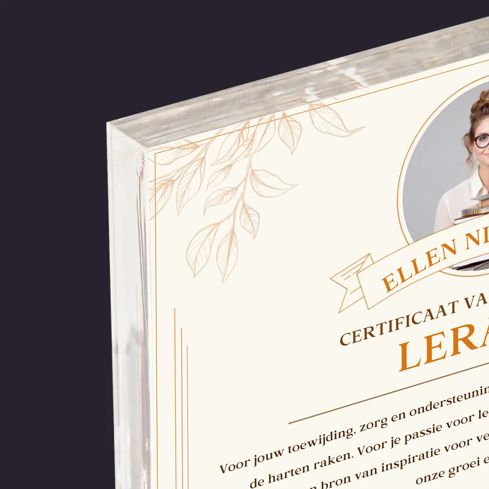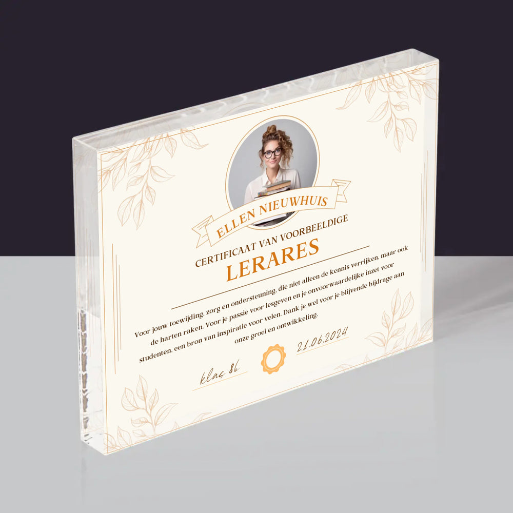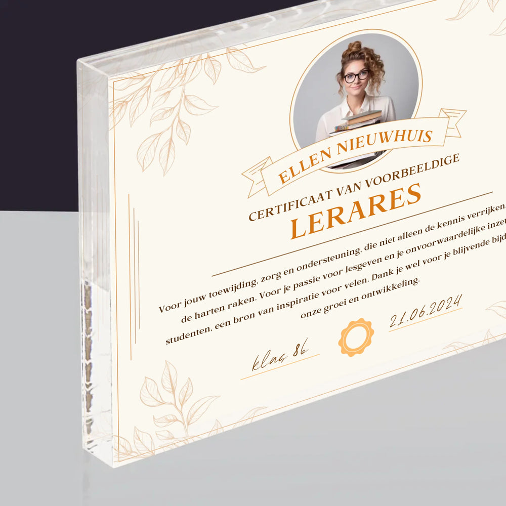 Foto En Handtekening: Certificaat Van Voorbeeldige Lerares - Acryl blok - Horizontaal