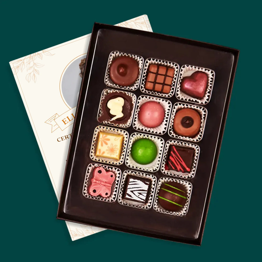 Heerlijke Belgische chocoladepralines in een elegante doos met de personalisatie naar keuze.