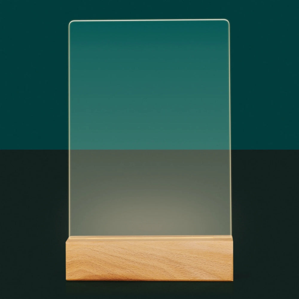 Afmetingen A5 glas: 21 x 12,5 cm, afmetingen houten standaard: 15 x 4,5 cm.Afmetingen A4 glas: 29,5 x 22 cm, afmetingen houten standaard: 15 x 4,5 cm