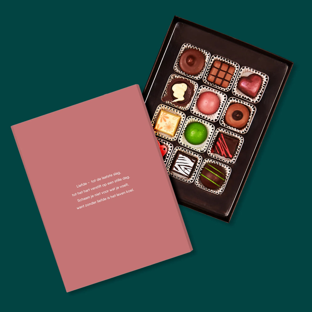 Heerlijke Belgische chocoladepralines in een elegante doos met de personalisatie naar keuze.