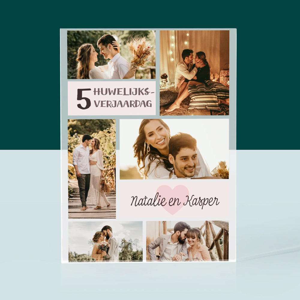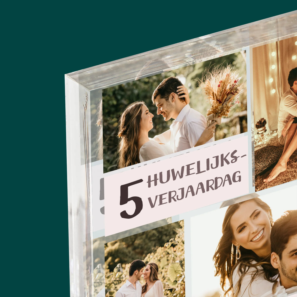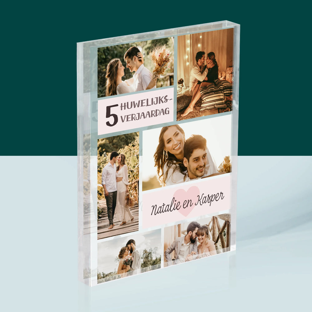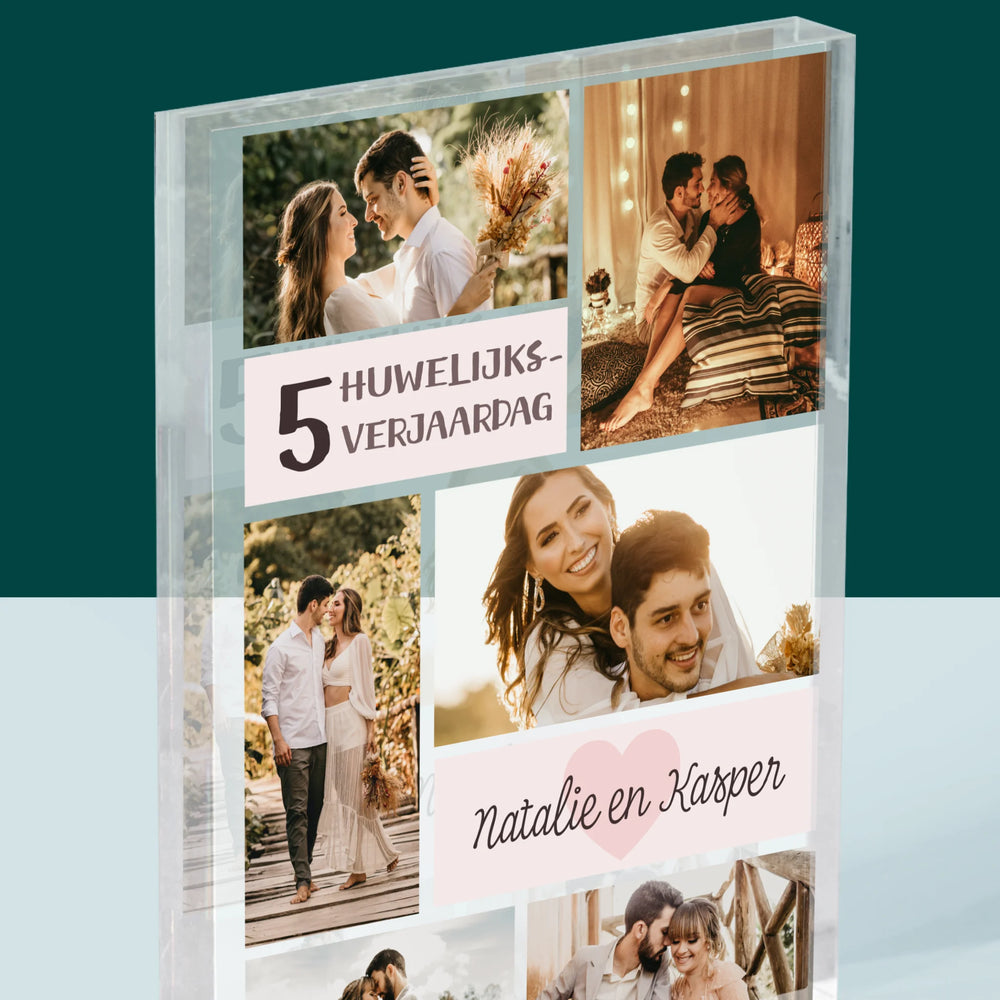 Fotocollage: 5De Huwelijksverjaardag - Acryl blok - Verticaal
