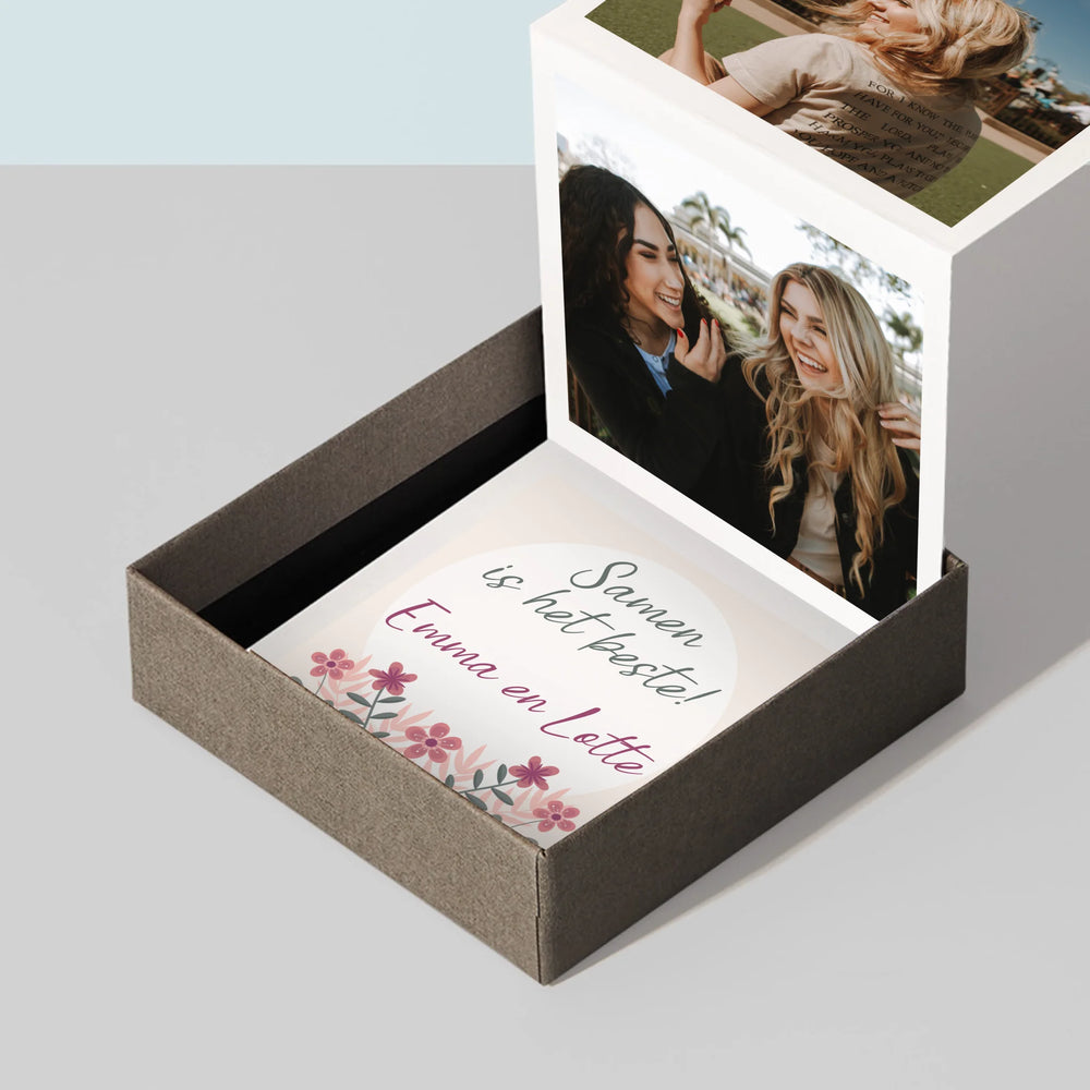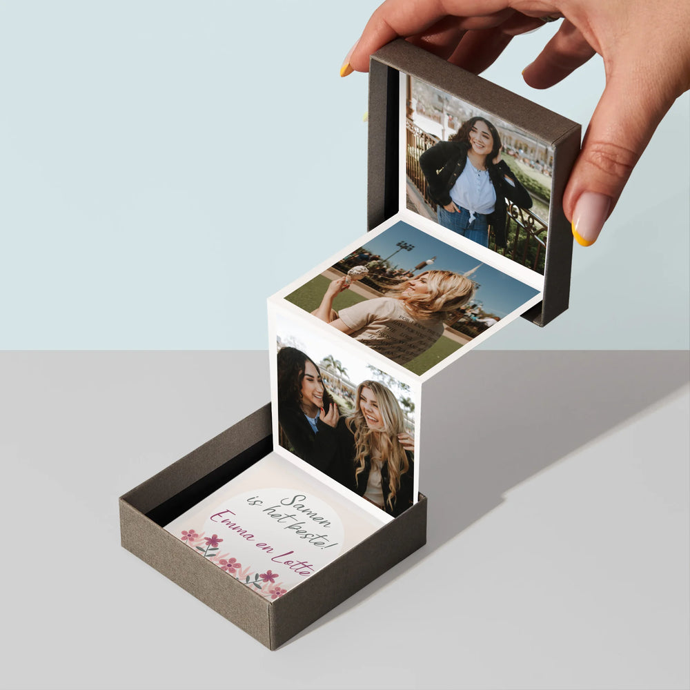 De accordeon bestaat uit drie foto's van 6,68 x 6,68 cm en een gepersonaliseerd kaartje met een opdracht voor de ontvanger