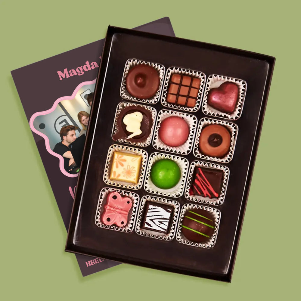 Heerlijke Belgische chocoladepralines in een elegante doos met de personalisatie naar keuze.