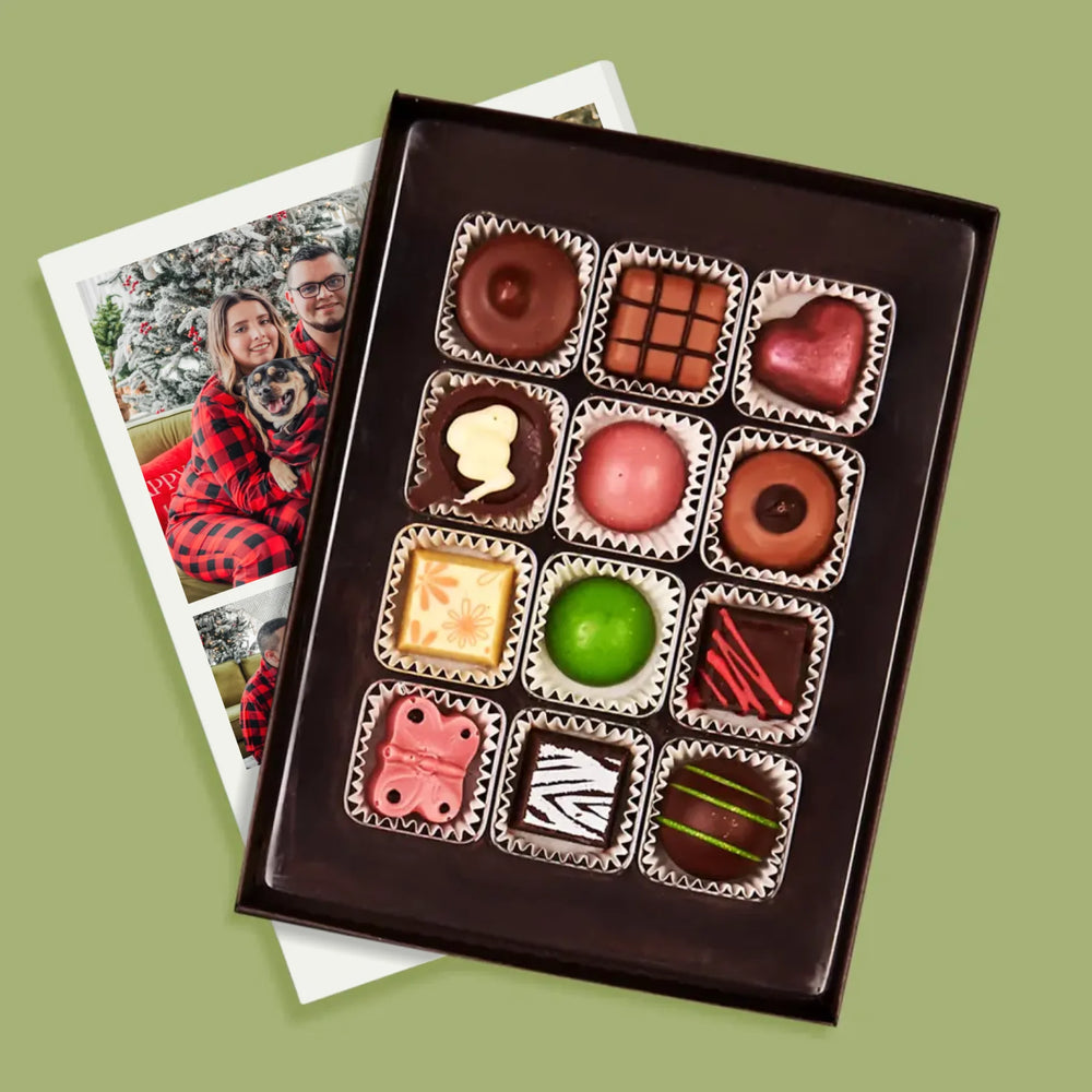 Heerlijke Belgische chocoladepralines in een elegante doos met de personalisatie naar keuze.
