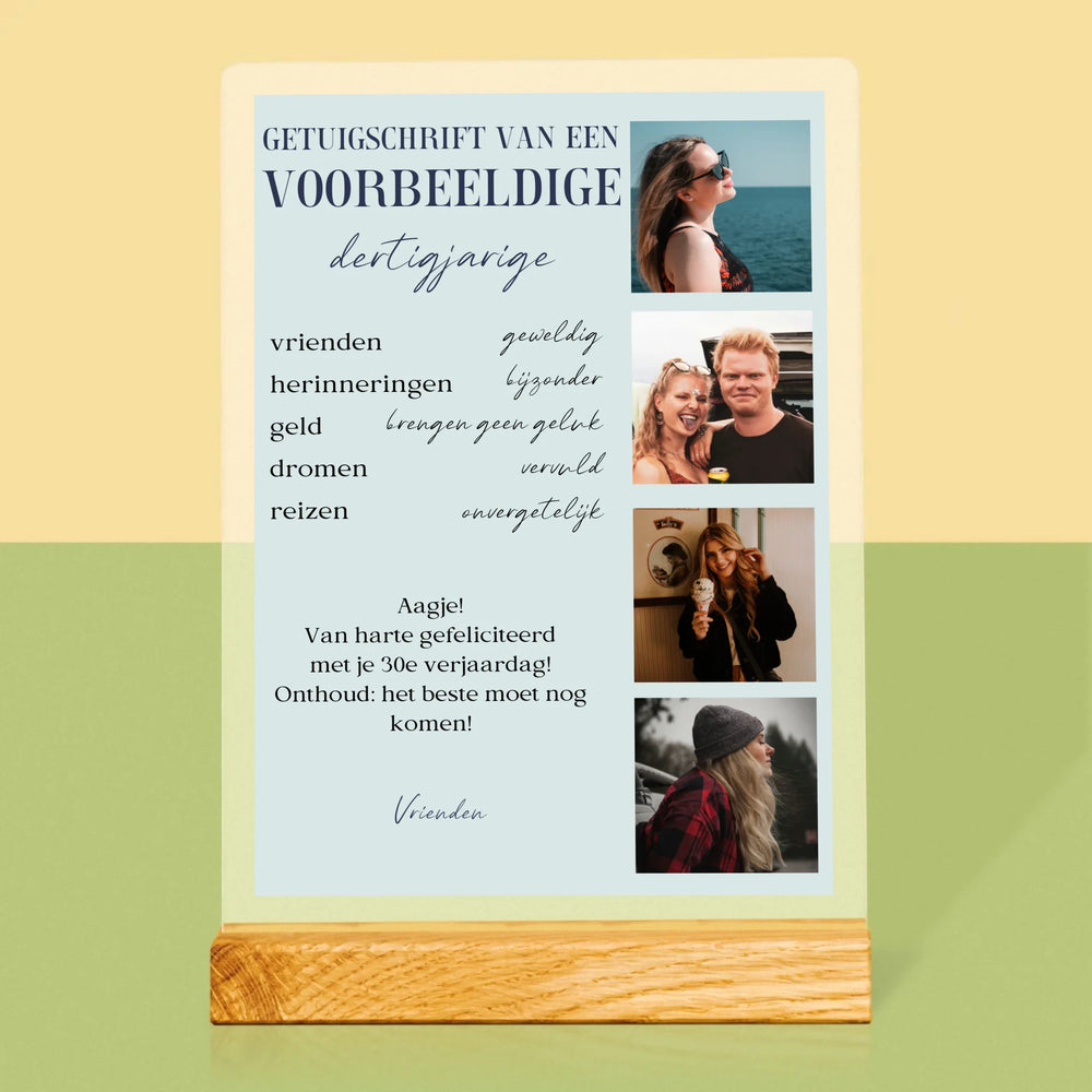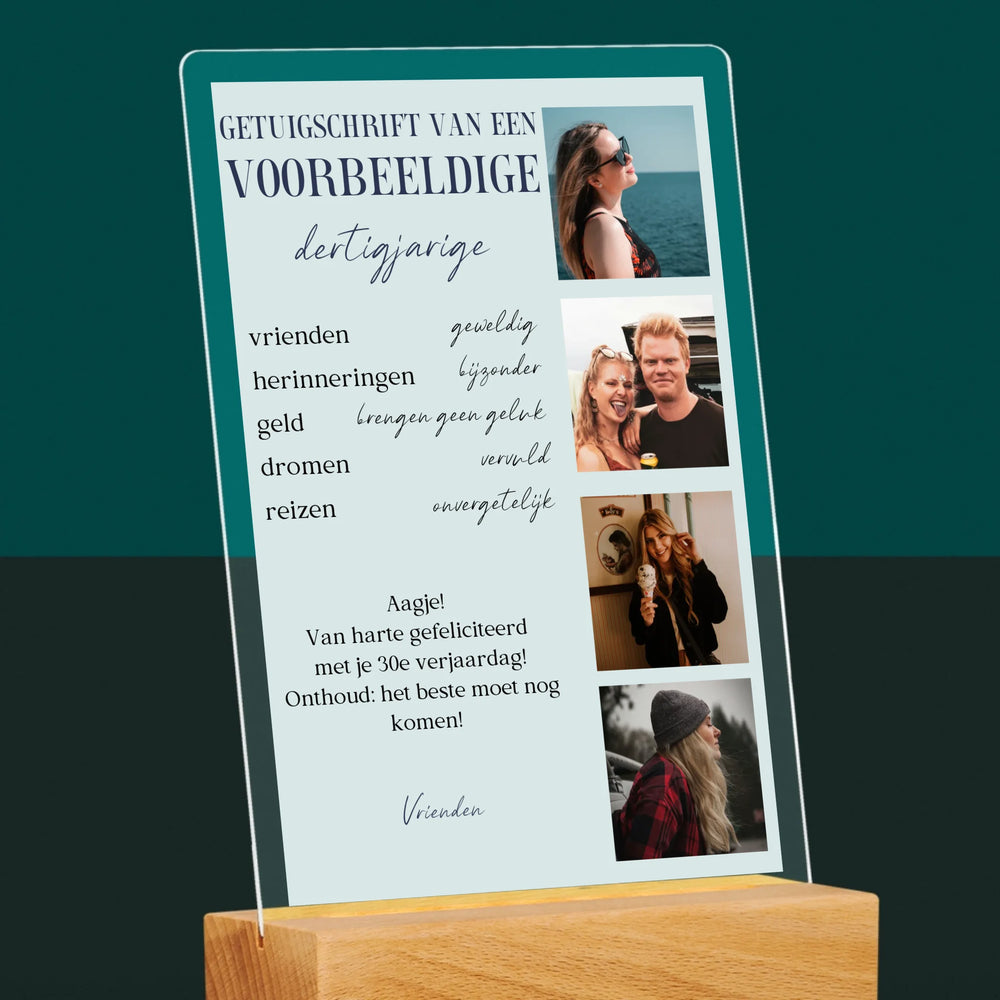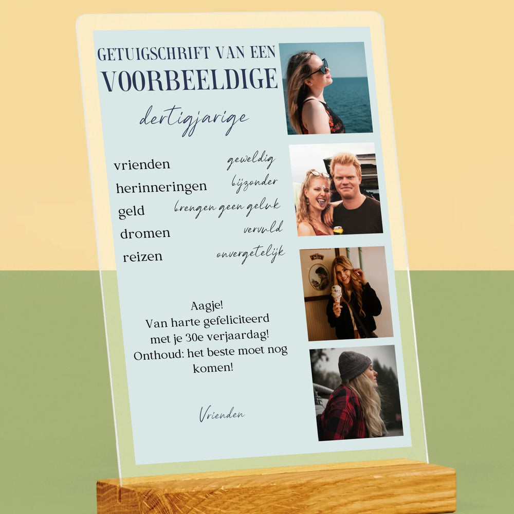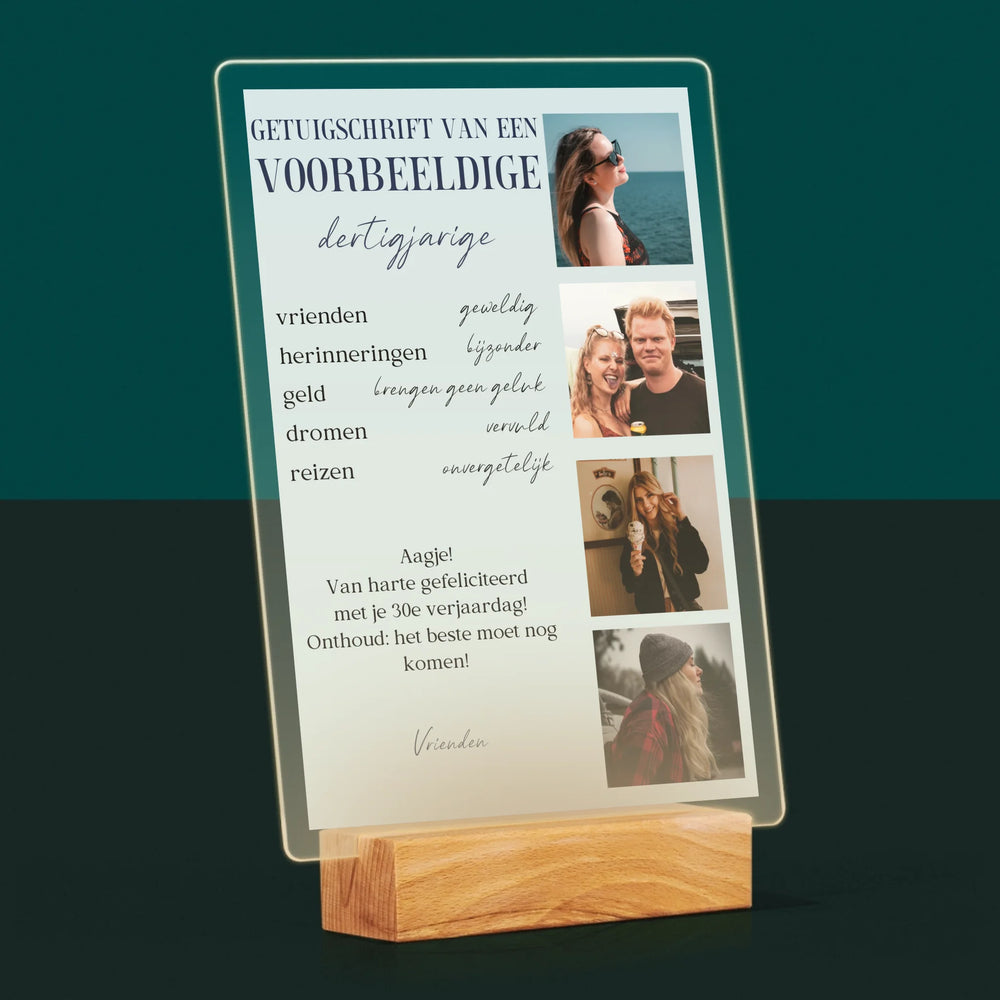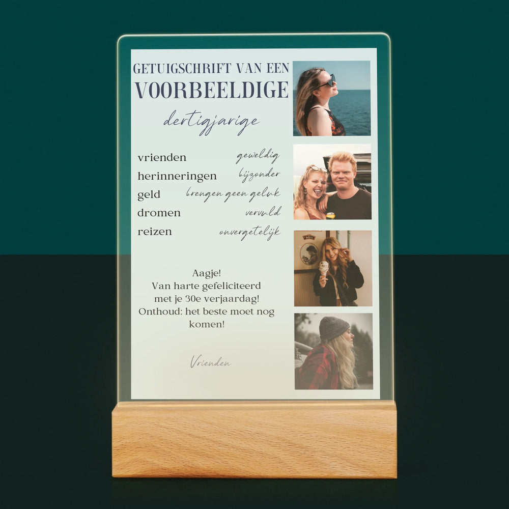 Fotocollage: Getuigschrift Van Een Voorbeeldige Dertiger - Afdruk op acrylglas met LED