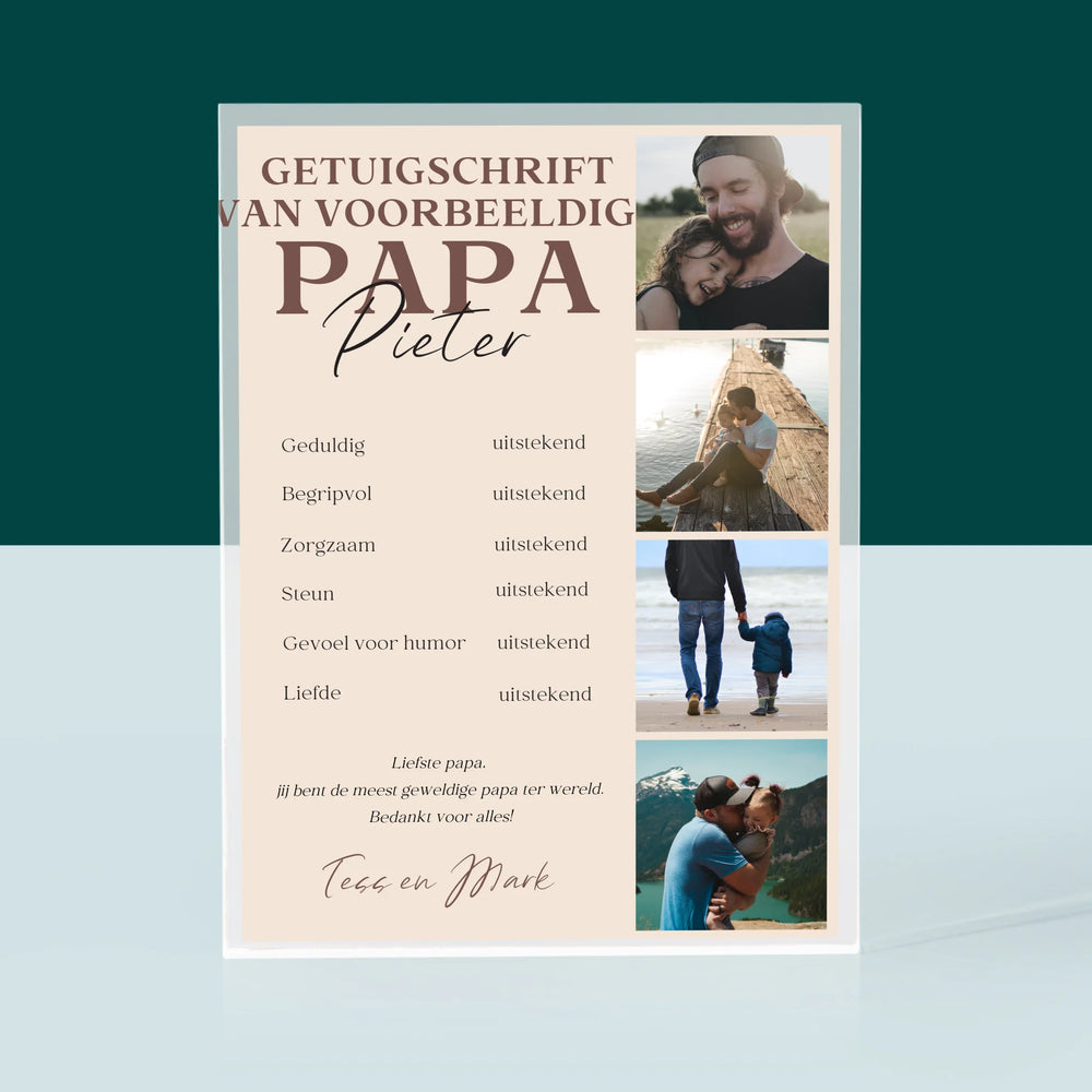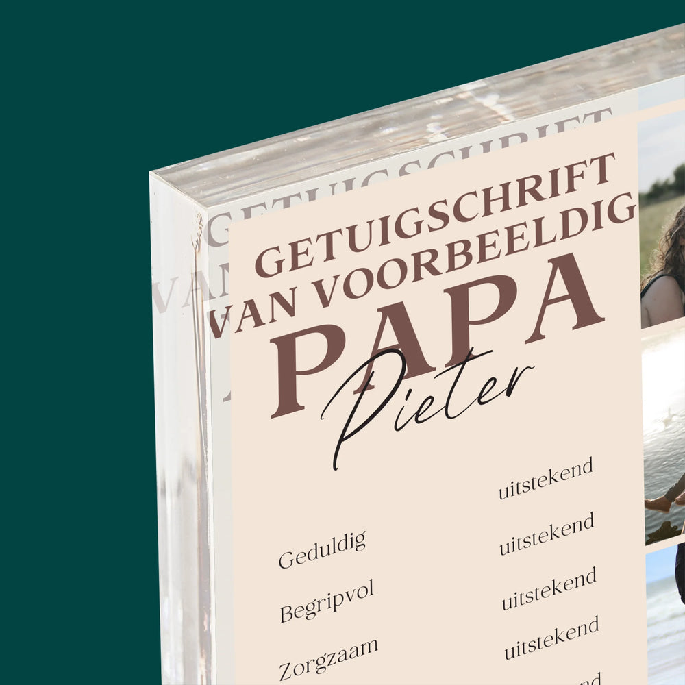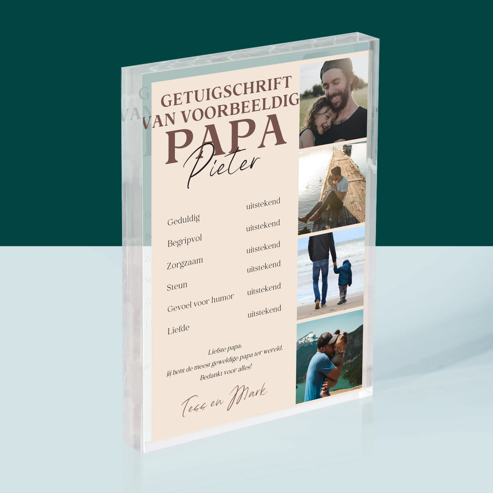 Fotocollage: Getuigschrift Van Voorbeeldige Papa - Acryl blok - Verticaal