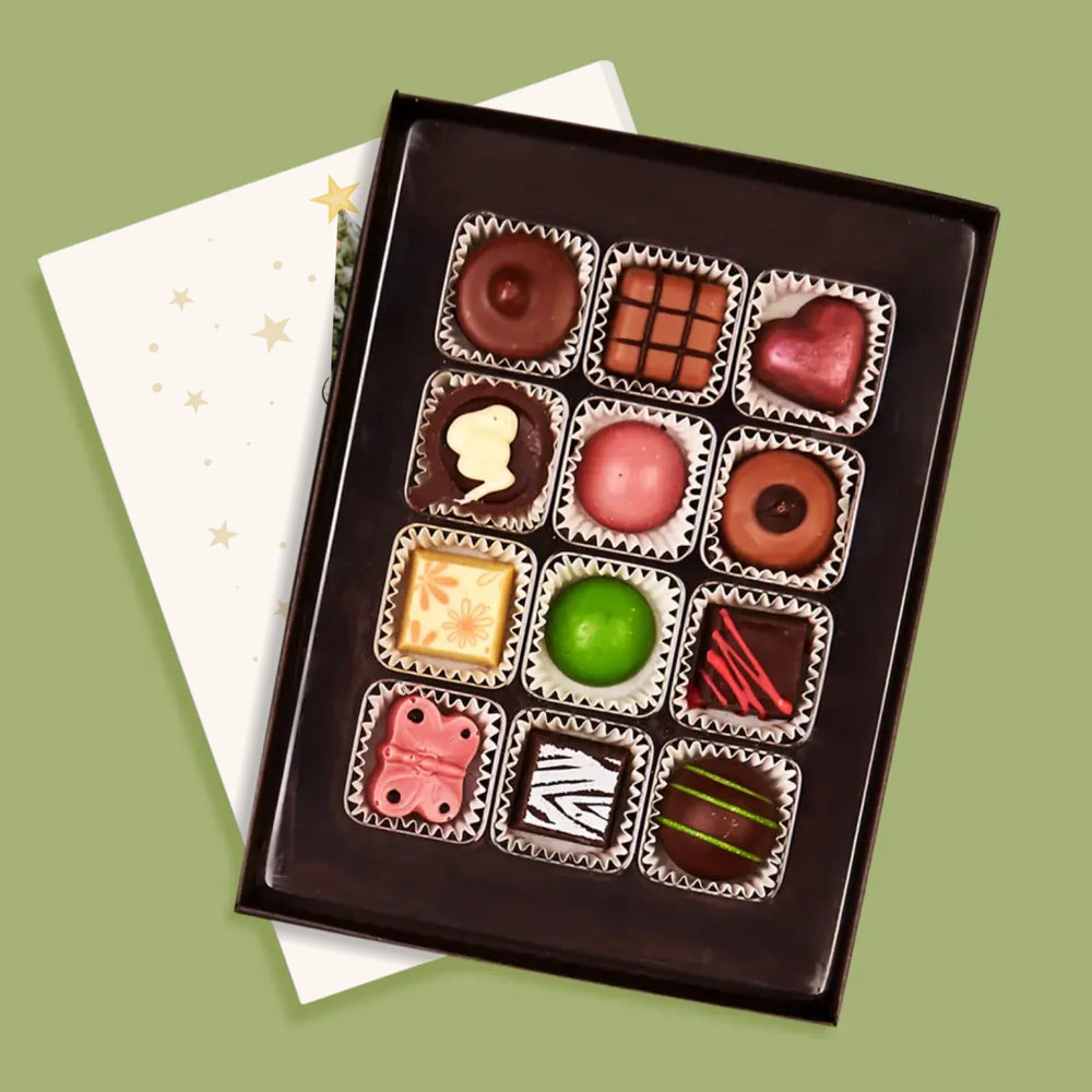 Heerlijke Belgische chocoladepralines in een elegante doos met de personalisatie naar keuze.