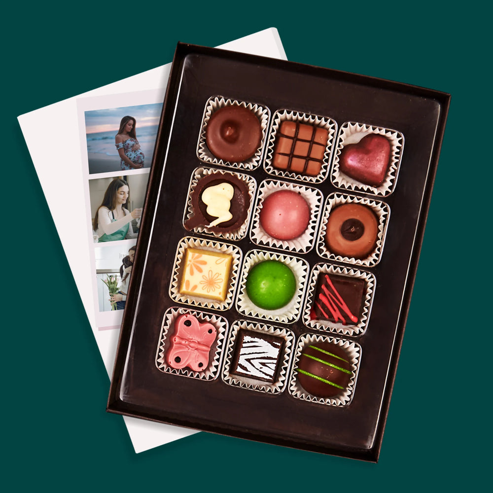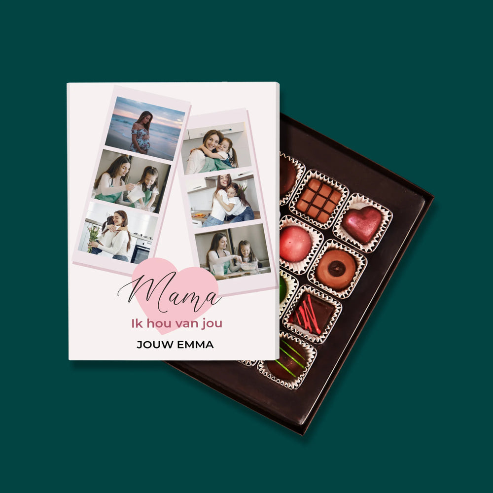 Heerlijke Belgische chocoladepralines in een elegante doos met de personalisatie naar keuze.